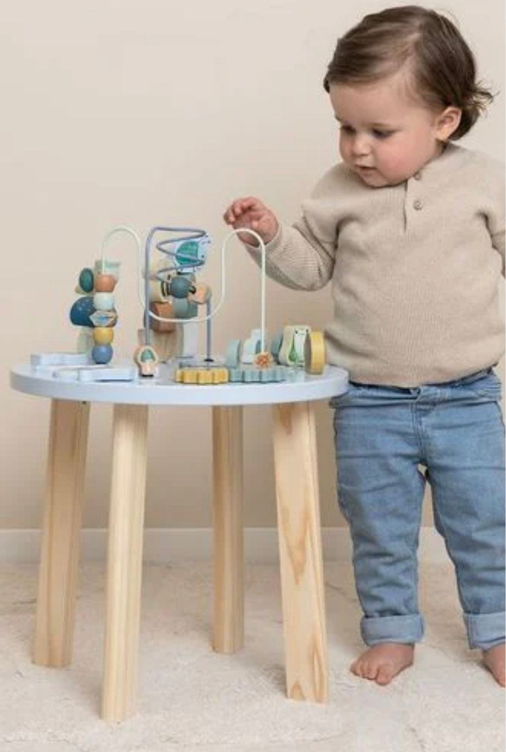 Stand up to play! Discover the many activities this table has to offer. Bring the beads along the spiral from one side of the enchanted forest to the other side. Or build a tower and fill the forest with trees of joy. Complete the puzzle, turn the wheels and help the lovely animals cross the Forest Friends woodlands. This wooden multi-activity table challenges your little one in many ways. There are 5 activities to explore that each support the development of fine motor skills. Thanks to the safe and balanced design, the activity table also encourages standing up. And staying up! Because the many features will keep your toddler engaged for a while. Assembly by an adult required.