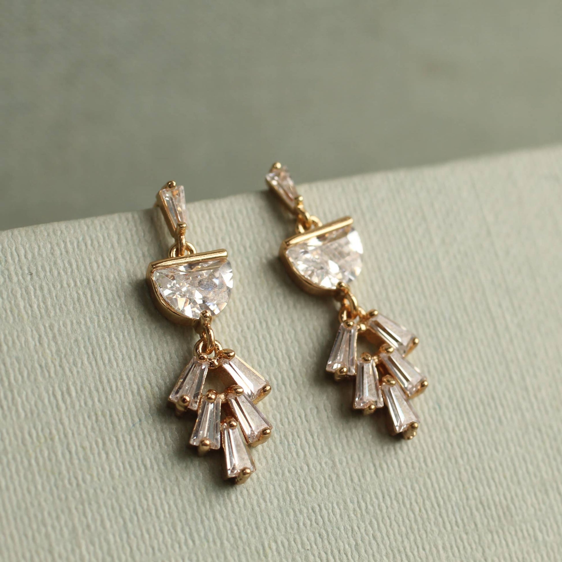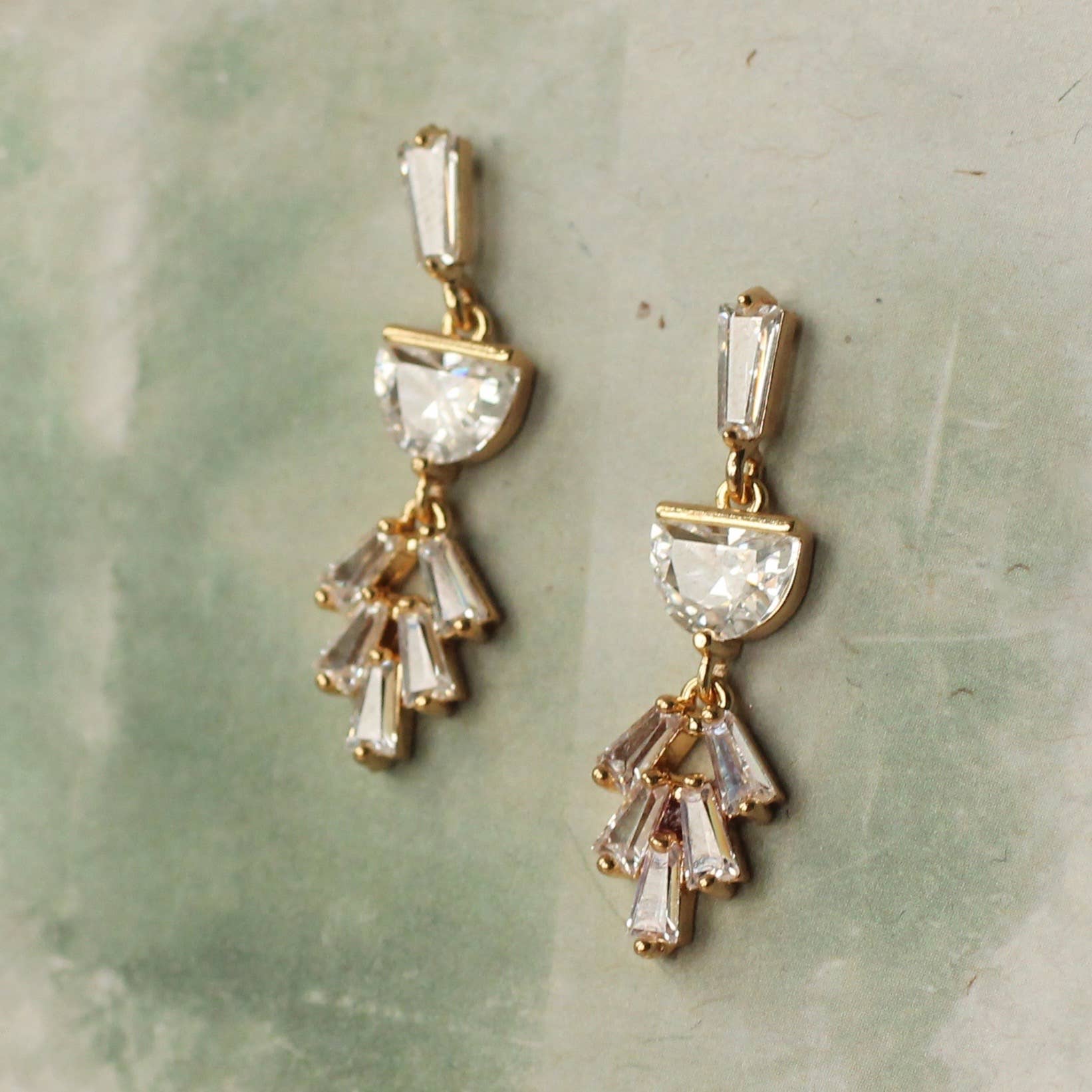 These art deco earrings feature a graduated design. They remind us of classic Deco architecture, like the Chrysler building! The earrings measure 40mm (just under two inches) in length and have gold plated ear wires.