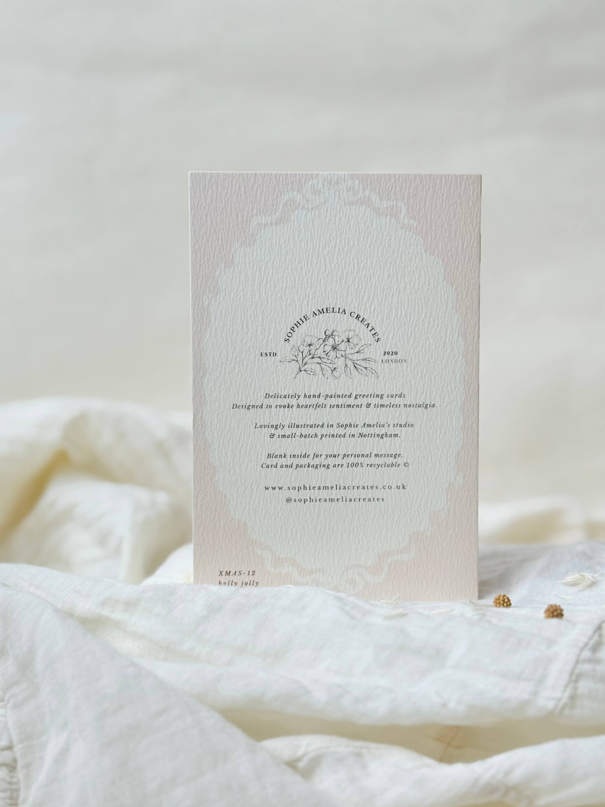 Charming festive illustration, dusted with a touch Christmas sparkle ; small batch printed on antique white, soft grain card.