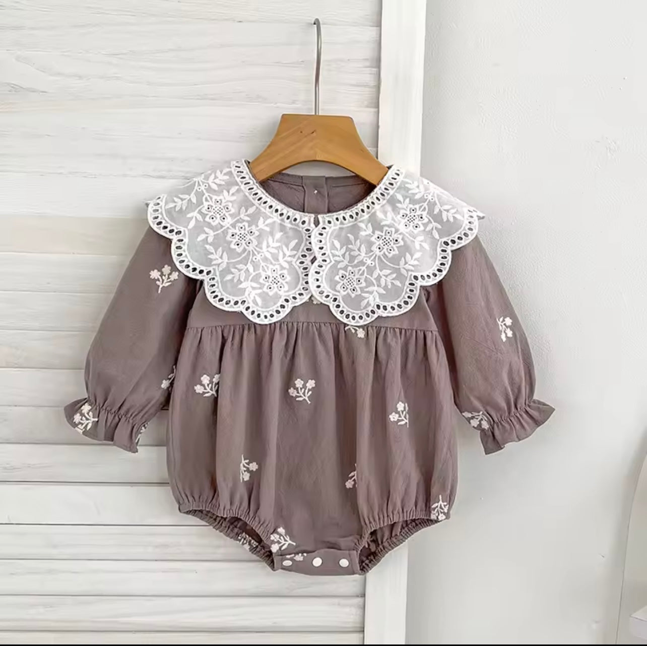 Beautiful coffee coloured romper with white cotton collar.