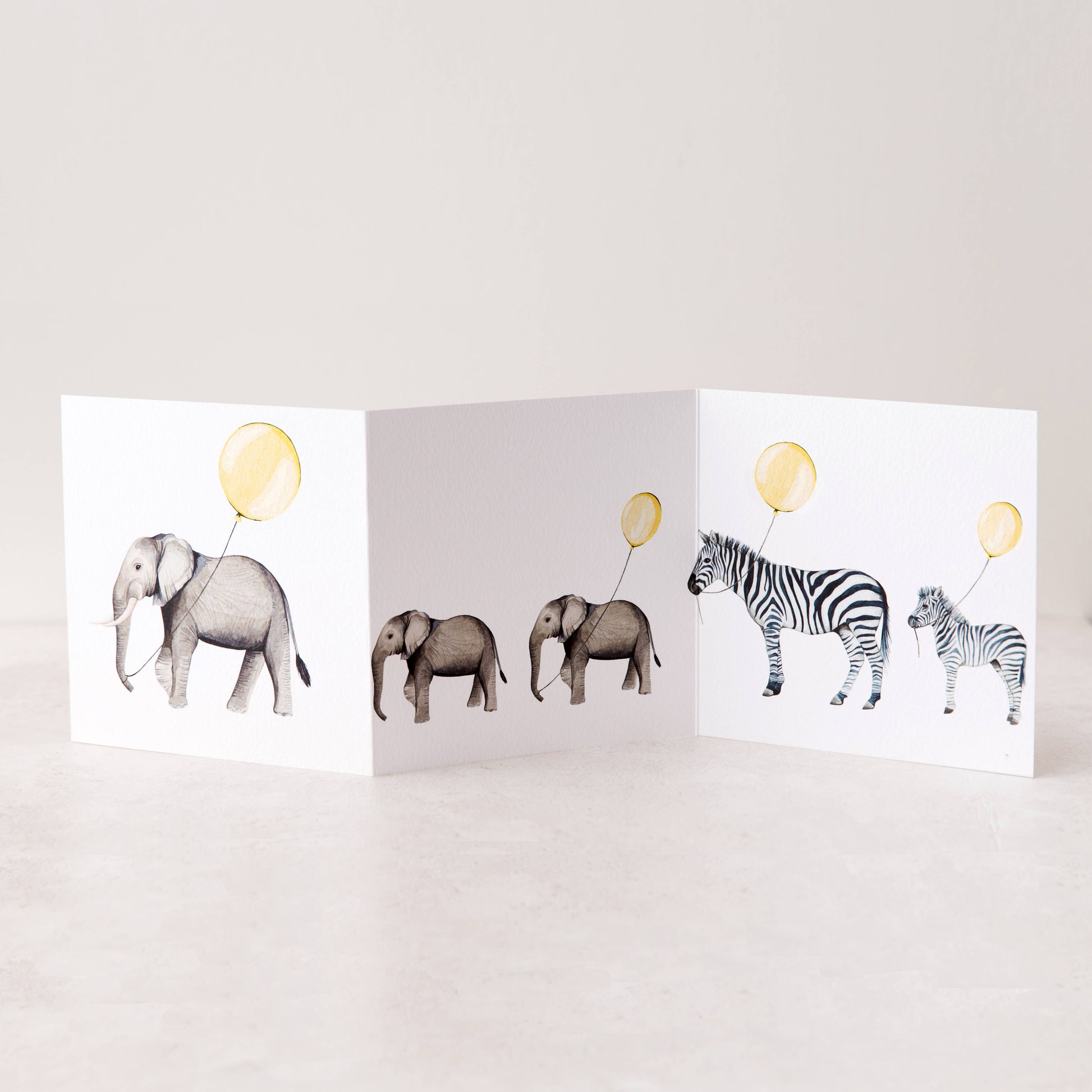 This intricately detailed concertina greeting card features an original watercolour elephant and zebra family illustration. The design unfolds to 3x its folded size and makes a wonderful keepsake and decor piece for a Nursery.