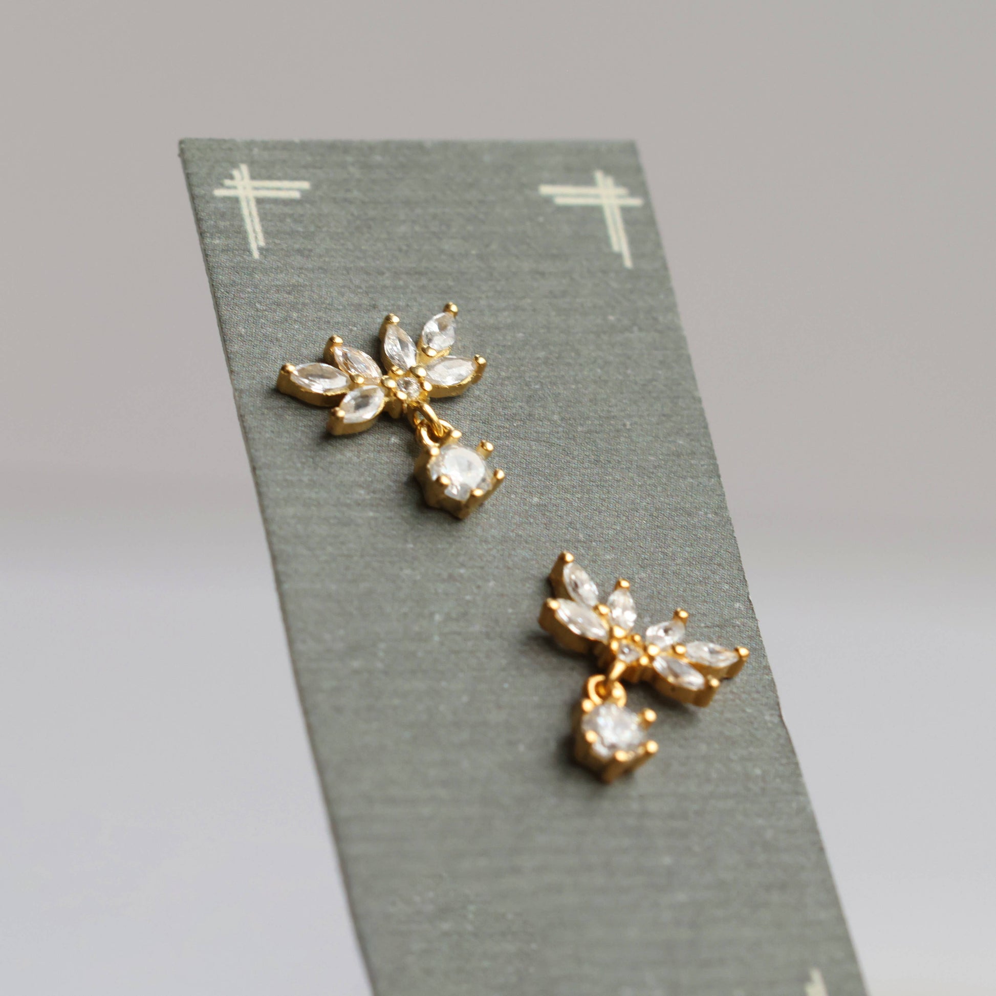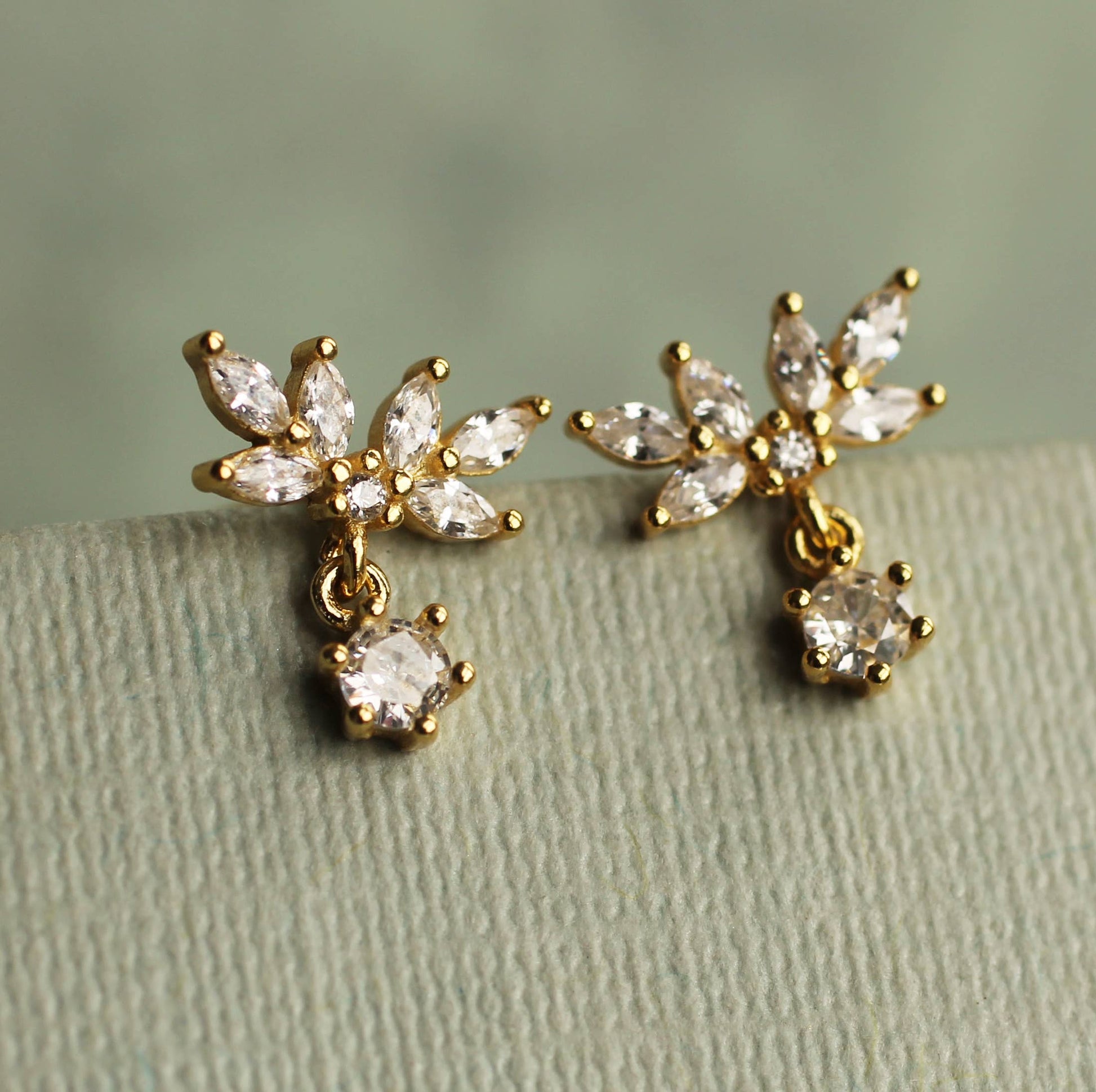 These beautiful and dainty stud earrings feature a pair of tiny cubic zirconia jewels, set in gold plated sterling silver to form an organic leaf shape. The earrings measure 10mm in length and are made of gold plated sterling silver (vermeil). These stud earrings come mounted on a linen presentation card. You also have the option of adding a well crafted glass presentation cloche.