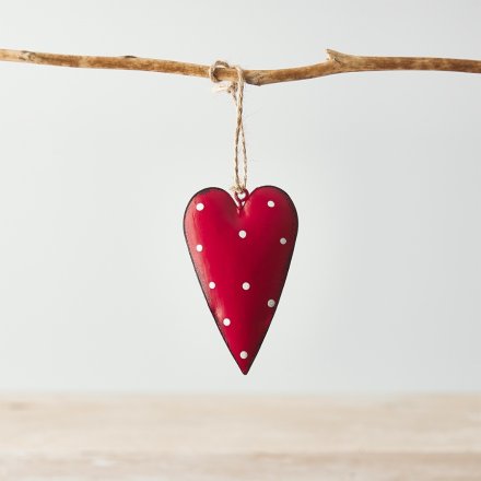 A red toned metal hanging heart with an overly distressed design and added white polka dot print to finish. Sure to add a rustic charm to any tree display during the Christmas Period!