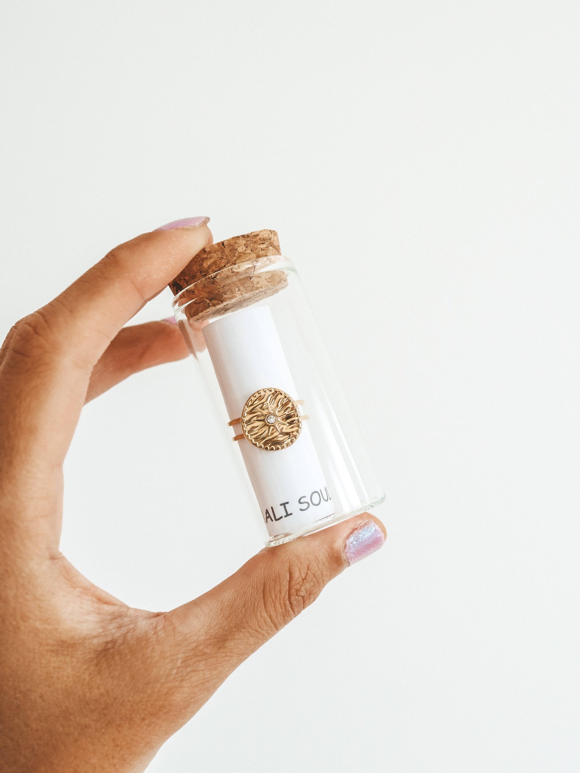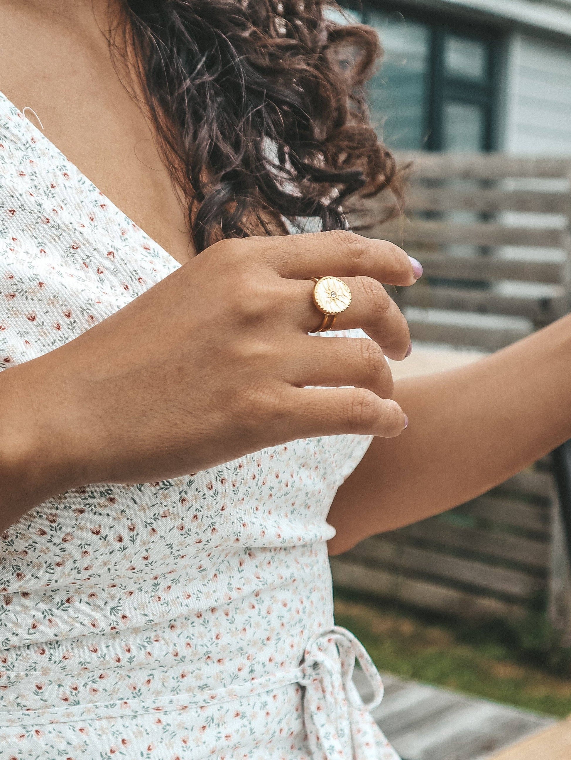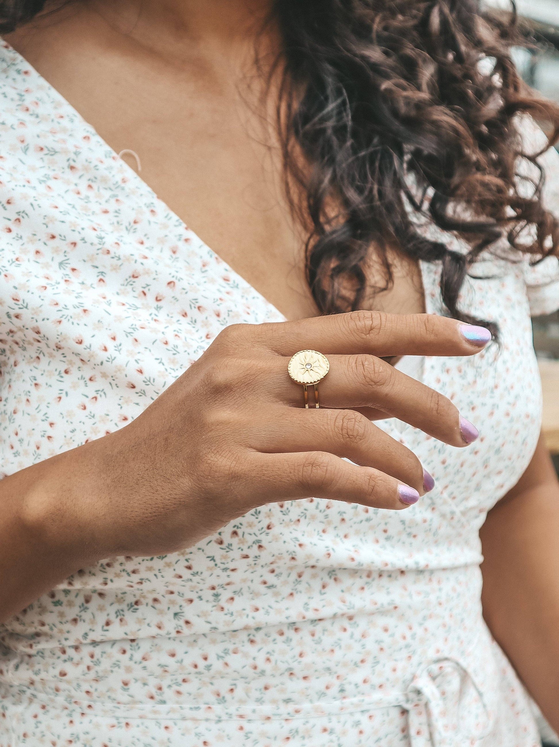 Add a touch of sparkle to your day with the Starburst Gold Ring. Its radiant design captures the magic of a starburst, making every gesture shine with playful elegance. Perfect for brightening up any outfit, this ring brings a joyful glow wherever you go.